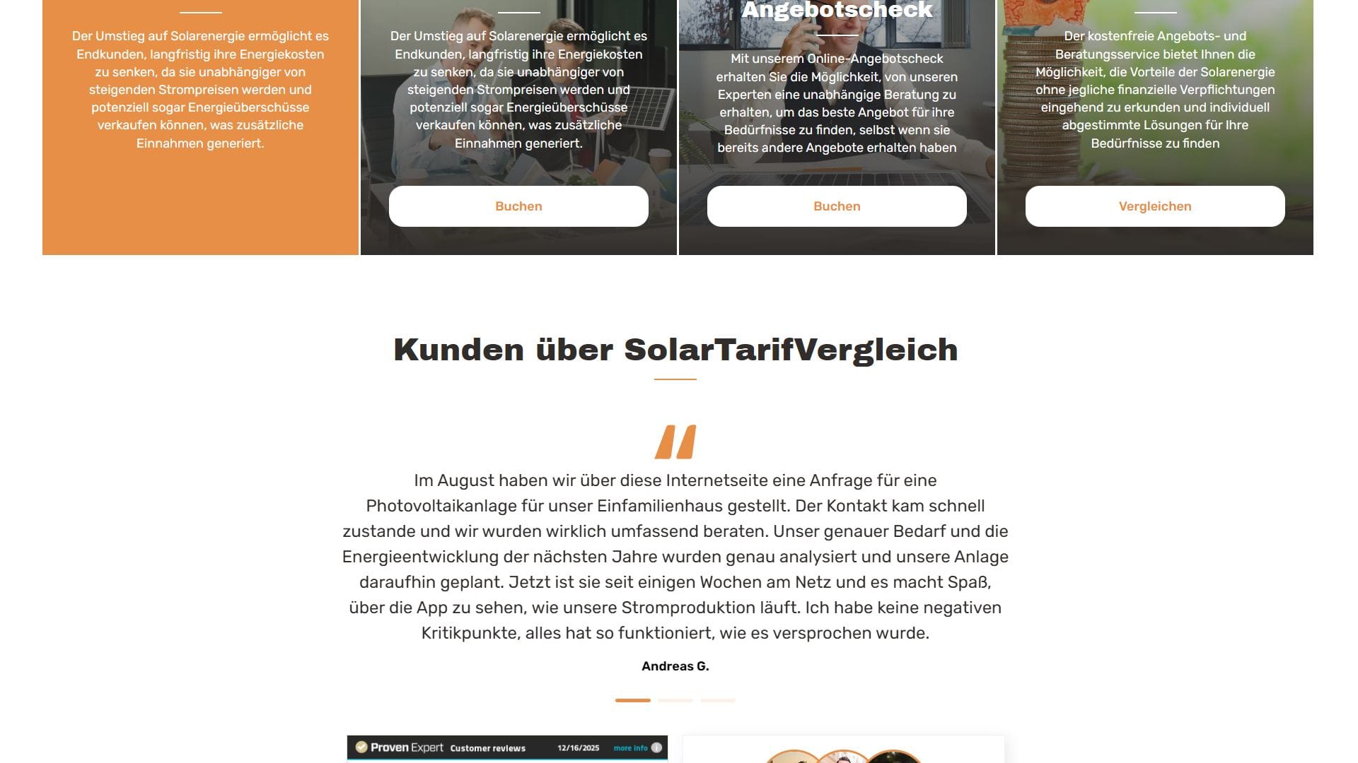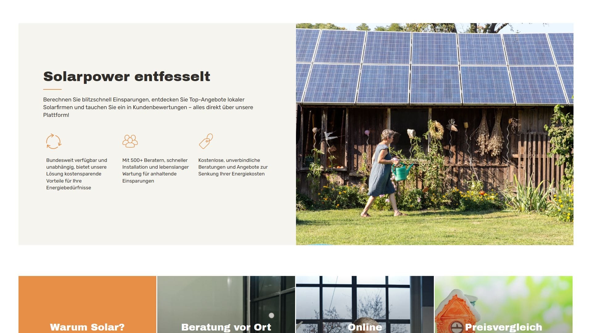 Almanya merkezli bir güneş enerjisi karşılaştırma platformu için, kullanıcıyı doğrudan aksiyona yönlendiren, hızlı ve güven veren bir web sitesi geliştirdik. Ziyaretçilerin kolayca teklif alabilmesi için hesaplama ve iletişim formlarıyla entegre, sade ve anlaşılır bir yapı kurguladık. Mobil uyumlu ve arama motorlarına uygun altyapısıyla, güneş enerjisine geçmek isteyen kullanıcıların doğru çözüme hızlıca ulaşmasını sağlayan, dönüşüm odaklı etkili bir dijital deneyim sunuldu.